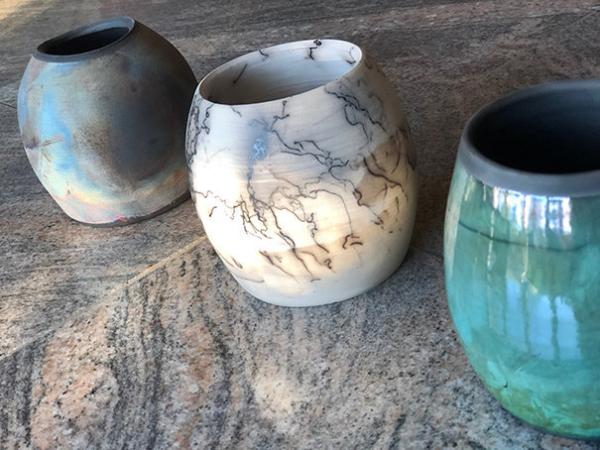After a very rewarding 40 year career as a graphic designer, I finally had the time to tackle my bucket list! What started as a class at Expressions has turned into the next chapter of my life and a love of playing in the mud, as my husband calls it. I gravitate towards natural materials, the grains in wood, the patterns of leaves and grasses, the tones of clay and glazes. Combining my passion of woodworking with pottery to make functional, as well as pieces of 'art' is an avenue I have just started to explore. For me, my happy place is creating and clay gives me endless possibilities!